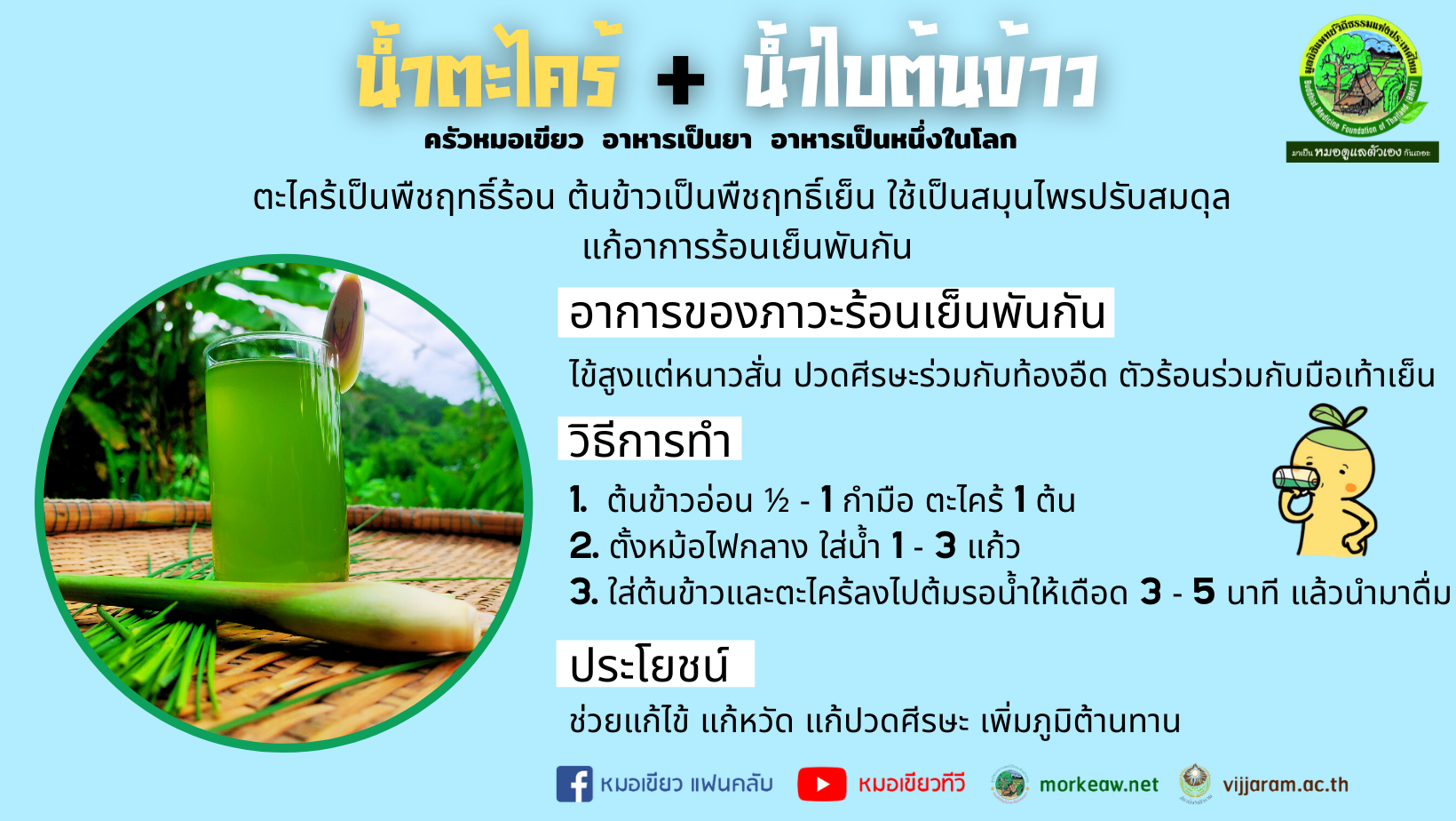ตะไคร้เป็นพืชฤทธิ์ร้อน ต้นข้าวเป็นพืชฤทธิ์เย็น ใช้เป็นสมุนไพรปรับสมดุล แก้อาการร้อนเย็นพันกัน